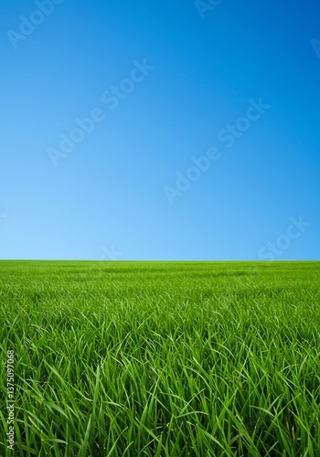 © NguyenHaiPhuong, Fototapeta premium Vibrant green field under a clear blue sky Serene landscape photo. AI Generated