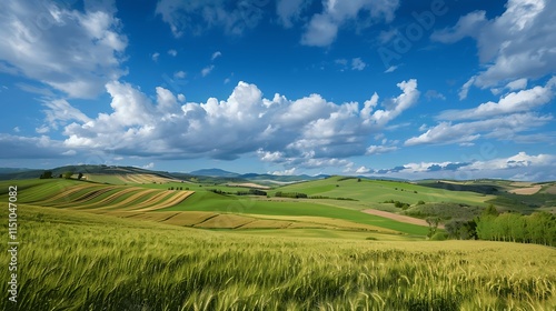 Obraz premium Vibrant Green Fields Under a Blue Sky