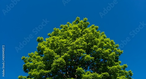 © artificial_azad!, Fototapeta premium Vibrant green foliage of a lush tree reaching towards a clear bright blue sky