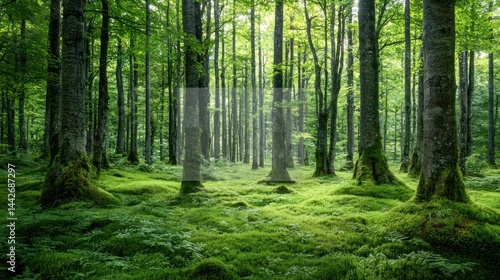 Obraz premium Vibrant green forest with thick tree trunks, moss, and lush vegetation on...
