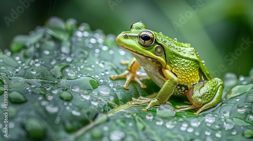 © Bijac, Naklejka premium vibrant green frog perched on dewy leaf after rainfall amphibian wildlife portrait photograph