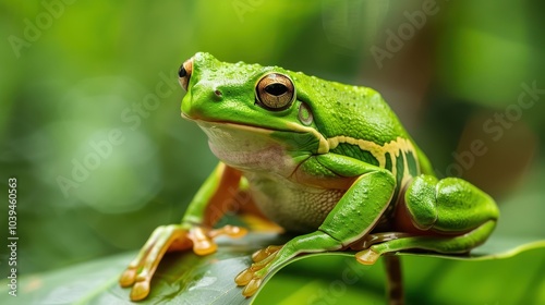 © AssanAI.Studio, Naklejka premium Vibrant Green Frog Perched on Leaf in Nature