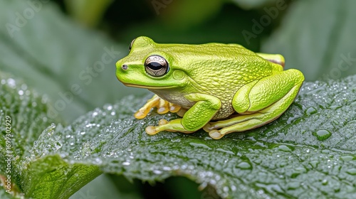 © Sudarat, Naklejka premium Vibrant Green Frog Resting on Leaf with Dewdrops in Nature