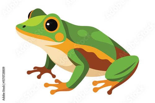 © Orpita, Obraz premium Vibrant green frog with orange accents on a white background