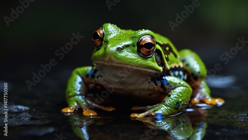 Naklejka premium Vibrant green frog with striking orange eyes rests serenely on a dark, reflective surface