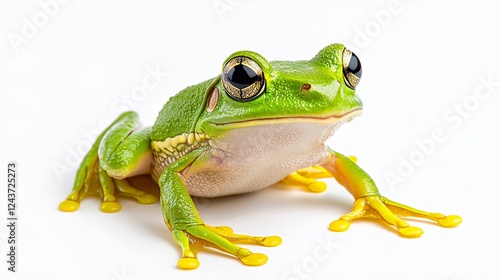 © ศาศวัต ธีรเศรษฐบดี, Naklejka premium Vibrant Green Frog with Yellow Toes Close Up, Detailed Macro Photography of Amphibian on White Background