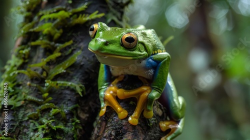 Fototapeta premium Vibrant green frog with yellow webbed feet perching on a tree trunk amidst lush green foliage, capturing a natural forest habitat in vivid detail.