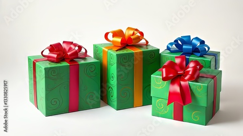 © Srinoun, Obraz premium Vibrant Green Gift Boxes with Ribbons - AI Photo
