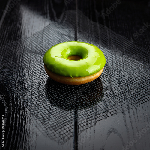 © image@9, Fototapeta premium Vibrant Green Glazed Donut on Black Textured Wooden Surface