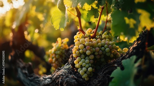 Fototapeta premium Vibrant green grapes ripening on the vine amidst sunlit vineyard foliage...