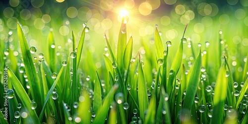 Fototapeta premium Vibrant green grass background with dew drops, nature, environment, foliage,...