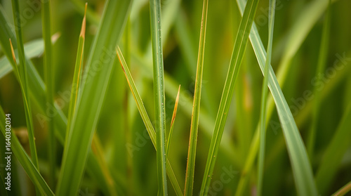 © Abdulloh, Obraz premium Vibrant green grass blades growing in nature close-up