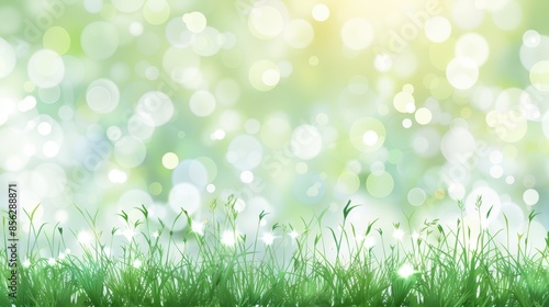 © mashimara, Obraz premium Vibrant green grass covered with dewdrops under a bright sunburst. The background features a dreamy, golden bokeh effect.