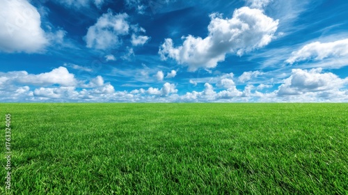 Fototapeta premium Vibrant Green Grass Field Under Bright Blue Sky with White Clouds