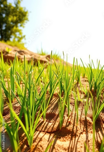 Fototapeta premium Vibrant green grass meets warm sandy earth under bright sunlight,...