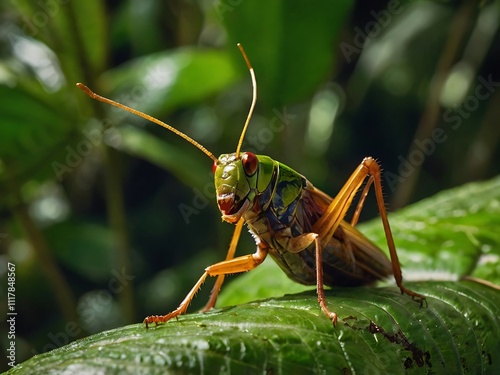 Fototapeta premium Vibrant Green Grasshopper Perched On Lush Leaf