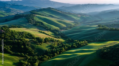 Naklejka premium Vibrant green hills and valleys at sunrise in a peaceful countryside landscape