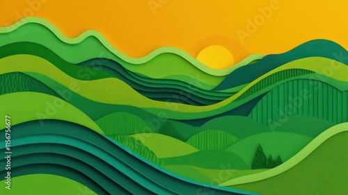 © Mnt, Obraz premium Vibrant green hills and valleys under a golden sunset sky.