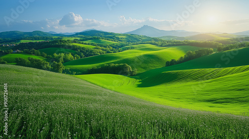 Fototapeta premium Vibrant green hills landscape, rolling hills and clear skies, serene natural...