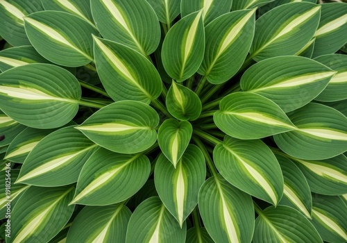 © Rejuan, Fototapeta premium Vibrant green hosta plant leaves with white and yellow variegation macro shot