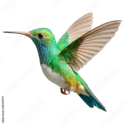 © Plaifah, Obraz premium vibrant green hummingbird in mid flight, showcasing its iridescent feathers and delicate wings. This beautiful bird symbolizes agility and grace in nature