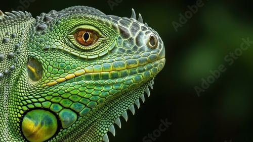 © Gabriel, Obraz premium Vibrant Green Iguana Close-Up with Golden Eye