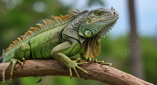 © Geyol, Naklejka premium Vibrant green iguana perched on a tree branch against blurred natural background