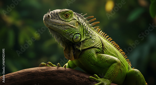 © mfahryf, Fototapeta premium Vibrant Green Iguana Resting on Brown Tree Branch Surrounded by Lush Foliage