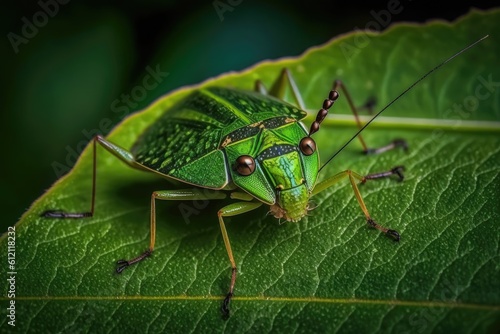 Fototapeta premium vibrant green insect perched on a leaf in close-up. Generative AI