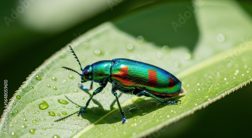 © photoplotnikov, Naklejka premium Vibrant green jewel beetle resting on dew-covered leaf