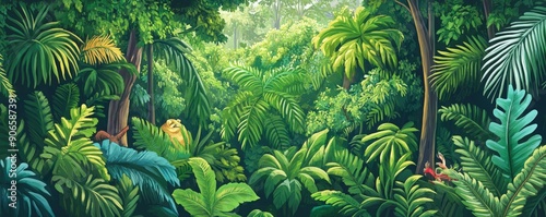 Fototapeta premium Vibrant green jungle scene showcasing dense foliage and lush plant life in a...