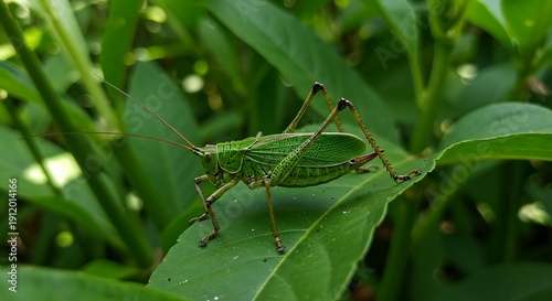© Dao, Fototapeta premium Vibrant Green Katydid in Lush Foliage