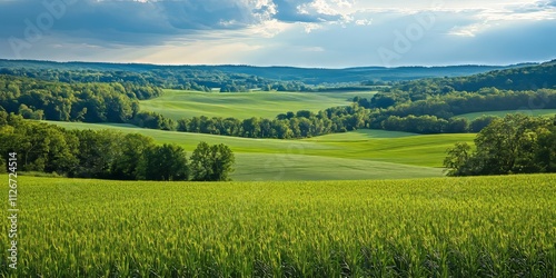 © Gular, Fototapeta premium Vibrant green landscape featuring expansive fields, lush trees, and a serene sky. This beautiful green landscape showcases nature s tranquility and beauty in rich hues of green and blue.