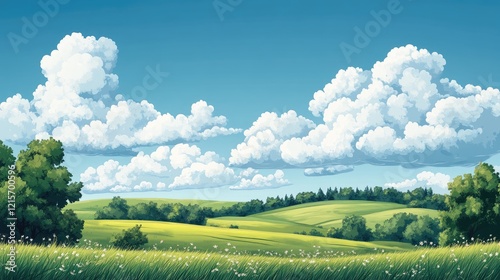 Obraz premium Vibrant green landscape with rolling hills under bright blue sky and fluffy...