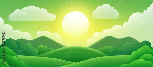 © GenZGraphics, Obraz premium Vibrant Green Landscape with Sun and Clouds Ideal for Text Overlay in Eco-Friendly Design Projects