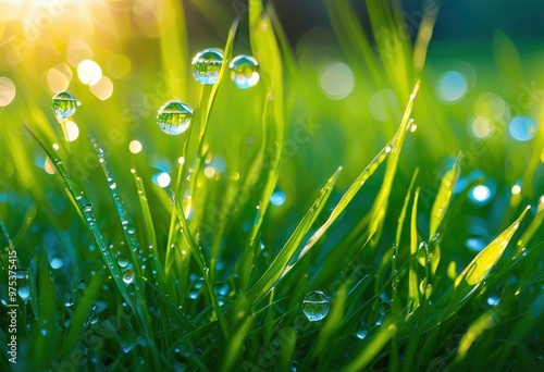 Fototapeta premium vibrant green lawn glimmering fresh morning dew sunlit outdoor setting,...