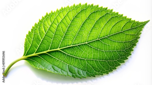 Fototapeta premium Vibrant green leaf with delicate veins and smooth edges rests alone on a pristine white background, evoking serenity and freshness.