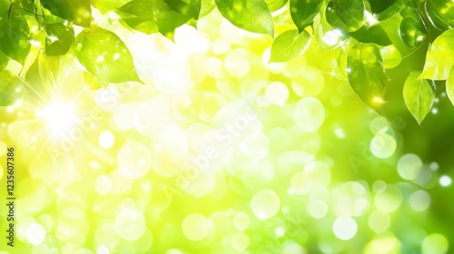 Fototapeta premium Vibrant green leaves frame a sunlit bokeh background, creating a bright and...