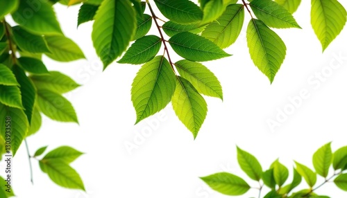 Fototapeta premium Vibrant green leaves, intricate details, crisp white backdrop, twig, closeup