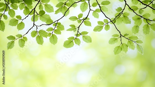 © Imam, Obraz premium Vibrant Green Leaves on Branch Against Soft Light Background