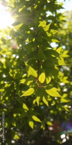 Obraz premium Vibrant green leaves, sunlight dappled, abstract bokeh, ecology, greenery,...