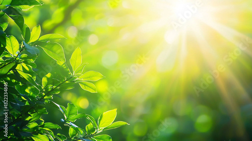 Fototapeta premium Vibrant green leaves sunlight nature spring fresh background tree rays lush...