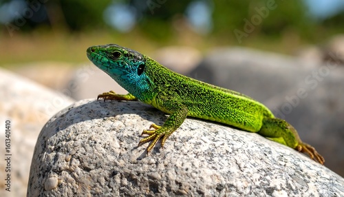 Fototapeta premium Vibrant green lizard basking on a sun-warmed rock, blending nature's textures