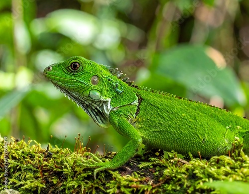 © akun, Fototapeta premium Vibrant green lizard on mossy branch