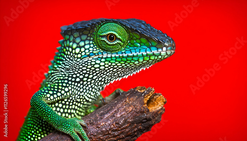 © Putu, Obraz premium Vibrant green lizard on red background, close-up profile view, exotic reptile, detailed scales, sharp focus.