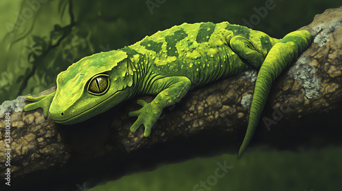 Naklejka premium Vibrant green lizard perched on a natural wooden branch