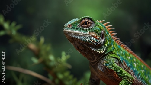 © titik, Fototapeta premium Vibrant green lizard portrait in lush foliage.