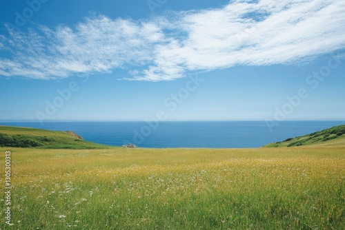 © Nyxoria, Obraz premium Vibrant green meadow overlooking serene blue ocean under a clear sky at midday