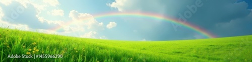 Naklejka premium Vibrant green meadow, rainbow arching overhead, scenic, field