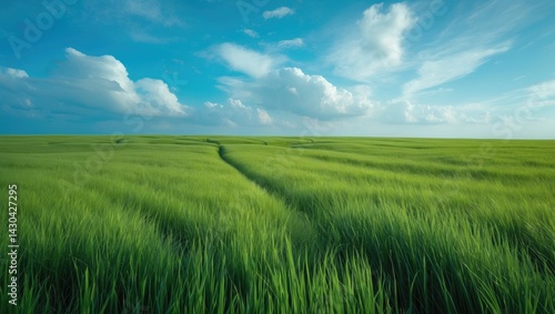 © VRVisionary, Fototapeta premium Vibrant green meadow under a bright blue sky